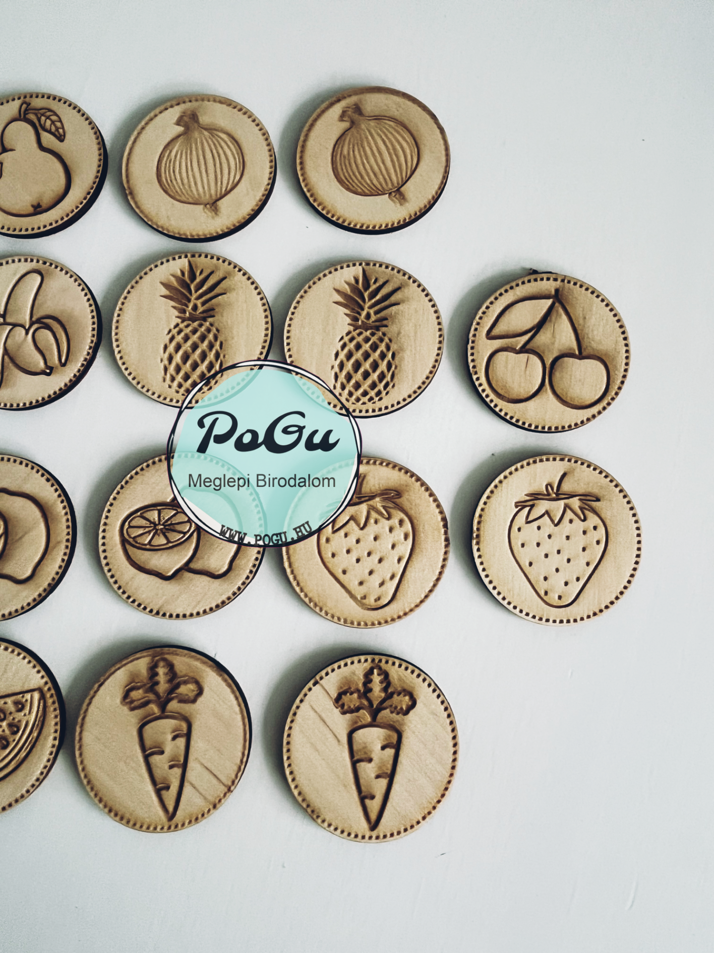 A szett tartalma: 20 db 4,5 cm átmérőjű kártya a képen látható motívumokkal.